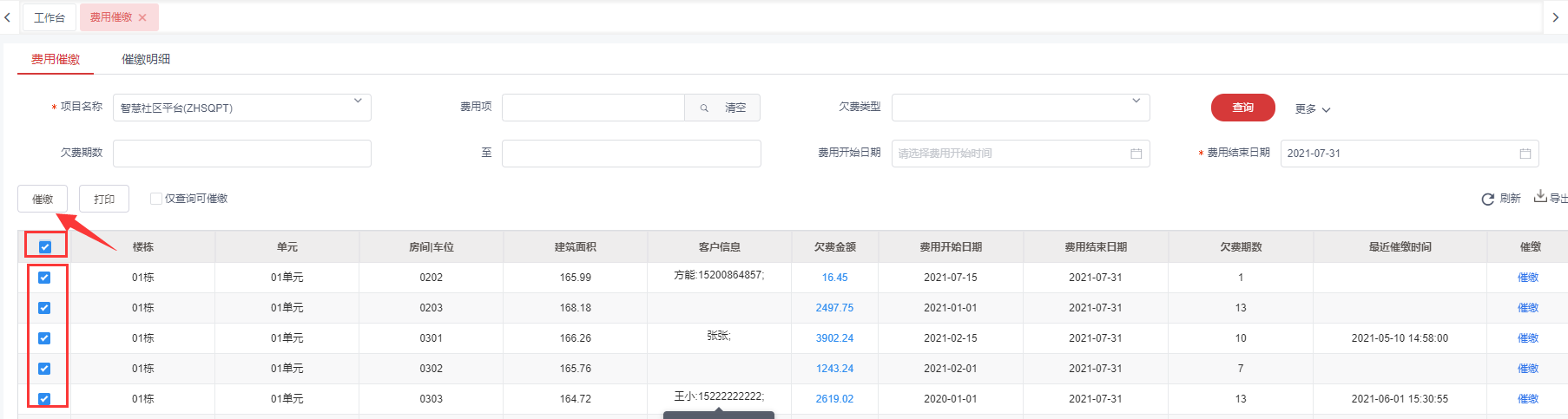 3.于列表勾选第一个方框则是全选,单个勾选需要催缴费资产,则是对多个资产催缴,选择后点击**催缴**按钮