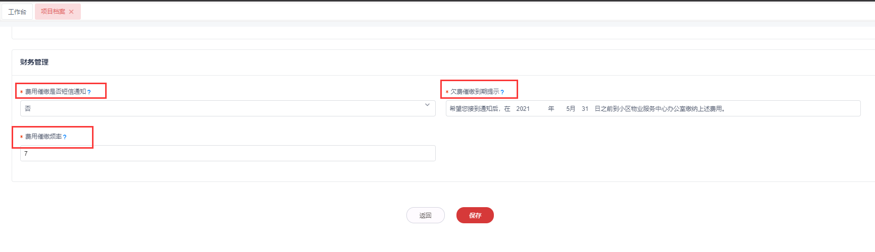 3.选择项目参数,设置财务管理汇总,费用催缴设置的相关信息。
