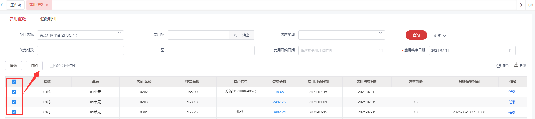 1.勾选需要打印的资产,然后点击**打印**按钮,则可以打印催缴单。