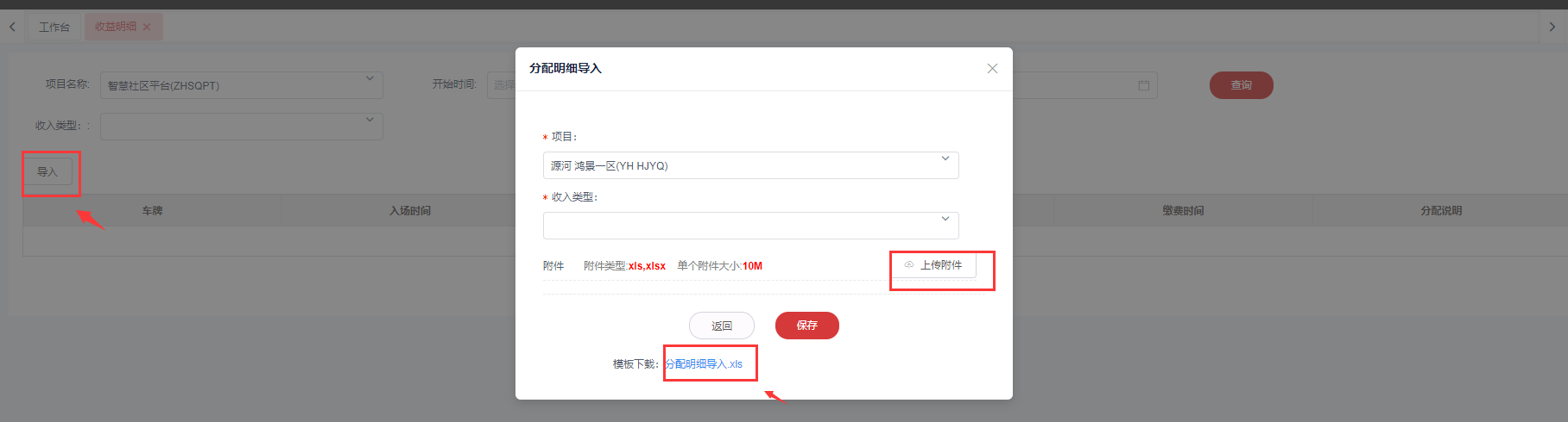 5. 在分配明细导入页面,选择收入类型,上传刚保存的模板,点击上传附件按钮,最后点击保存。