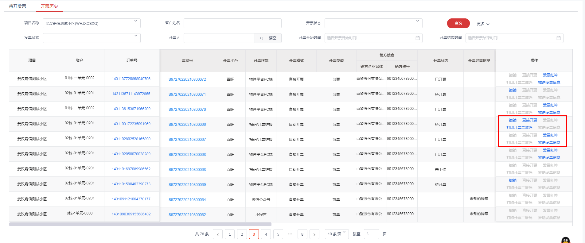 2.列表中展示已开发票数据,针对不同数据进行撤销、直接开票、票据红冲、打印开票二维码、推送发票信息