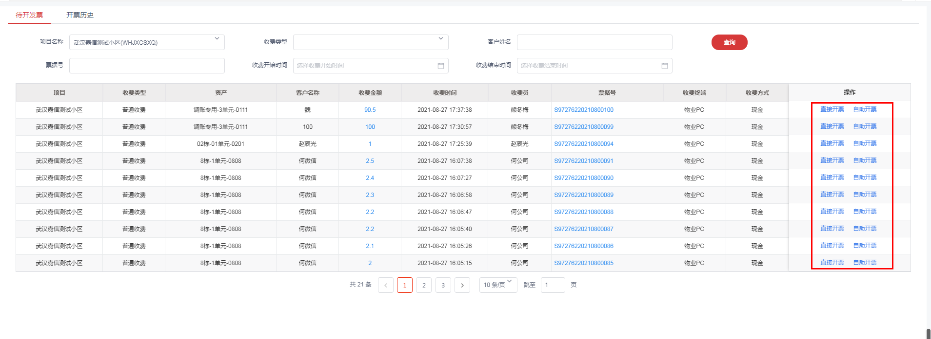 2. 列表中展示待开发票数据,点击直接开票或自主开票进行开票。