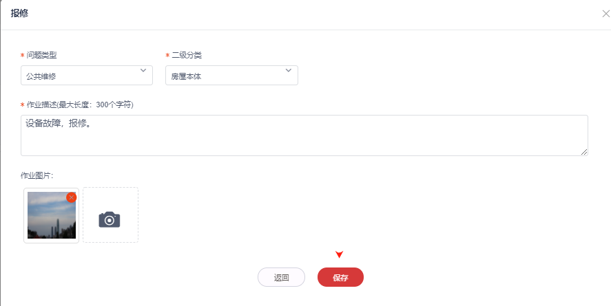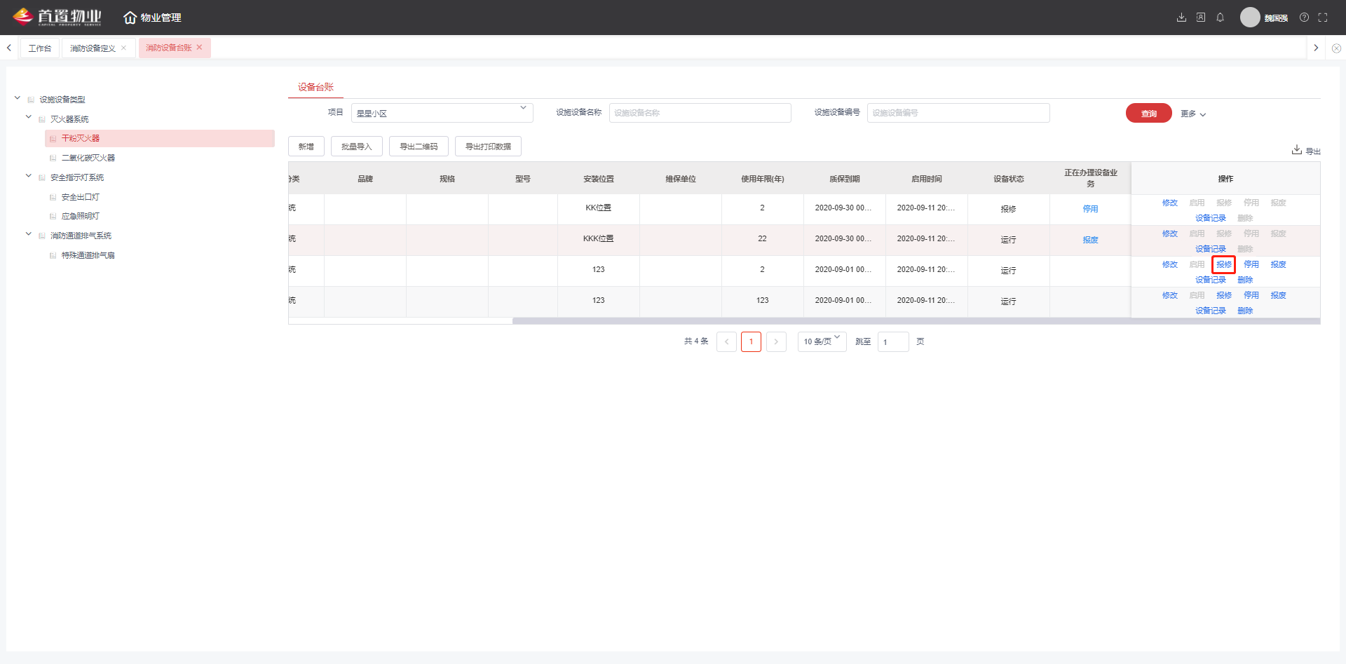6,填写报修信息后,点击保存,设备状态为报修