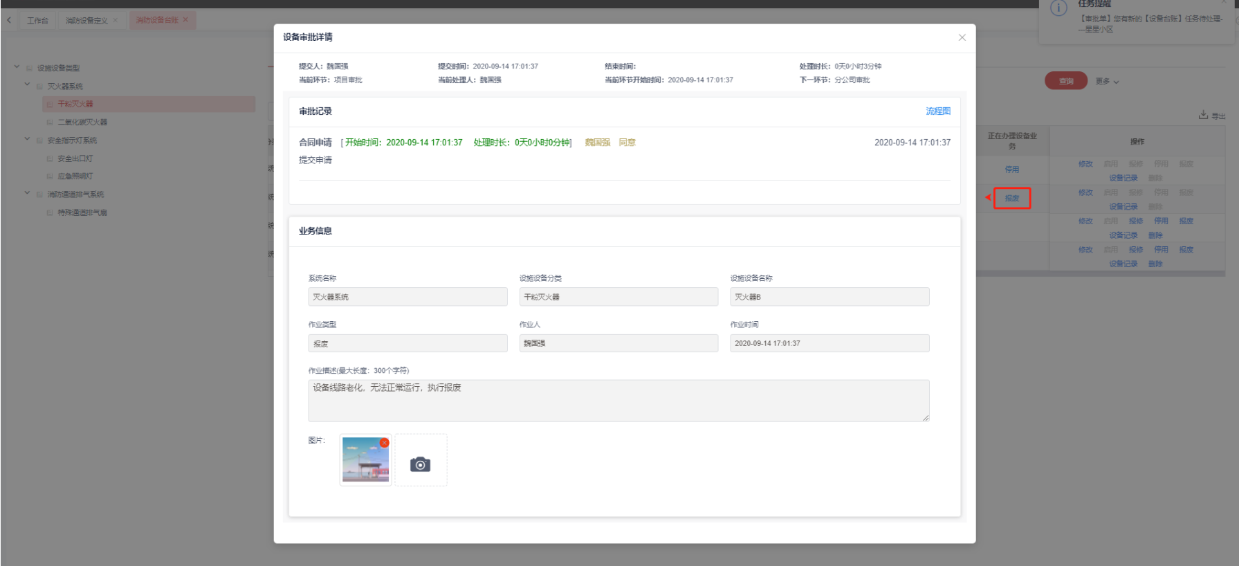 说明:停用,报废,启用走审批,报废提交后生成审批单,审批通过设备状态更新,点击 **正在办理的业务**可查看审批情况