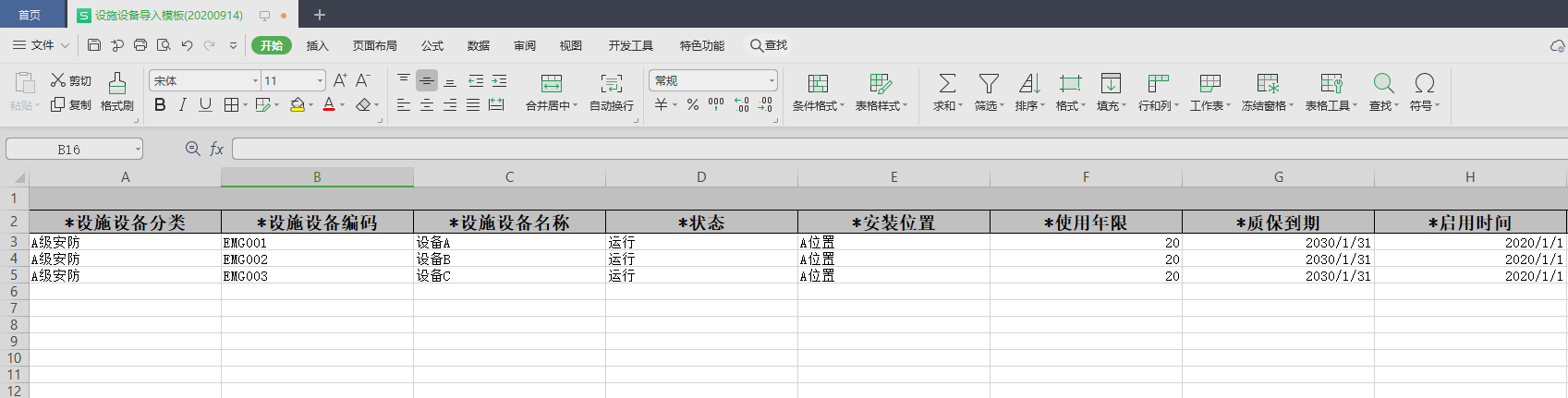 3,下载完成后,打开设备台账导入模板,根据目录和消防设备分类批量录入设备信息,保存