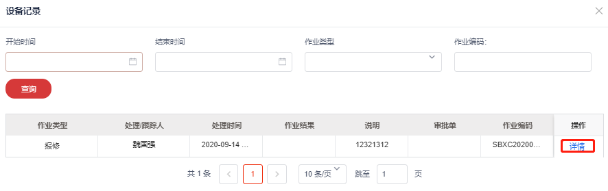 1,选择需要查看设备作业记录的设备信息,点击操作域的设备记录按钮,进入设备作业记录页面