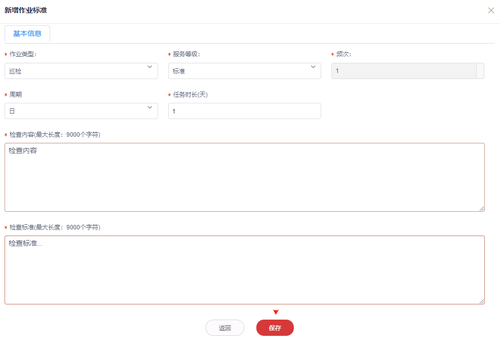 3,填写消防巡查标准(服务等级和项目参数对应才会生成对应的巡检计划/任务),点击保存按钮