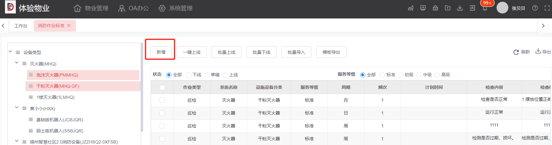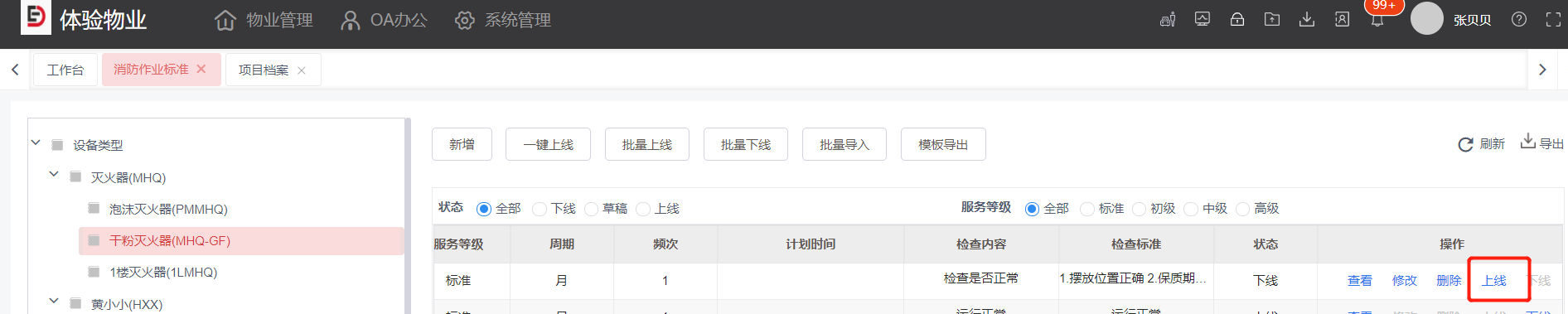 1,选择需要启用的消防设备巡检作业标准,点击上线按钮