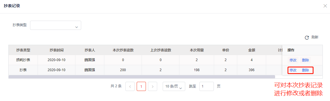3,查看列表或抄表记录,可查看,修改,删除本次抄表记录