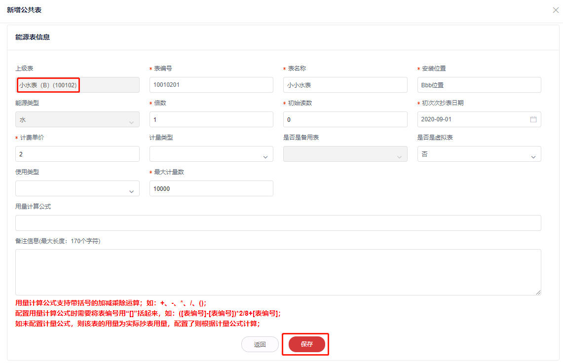 2,进入能源表信息填写页面,注意查看上级表是否正确,填写能源表信息,点击保存