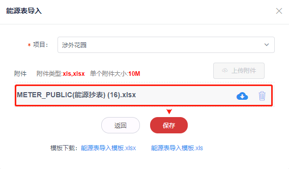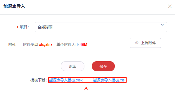 4,上传附件,选择填写好的能源表批量导入模板,保存