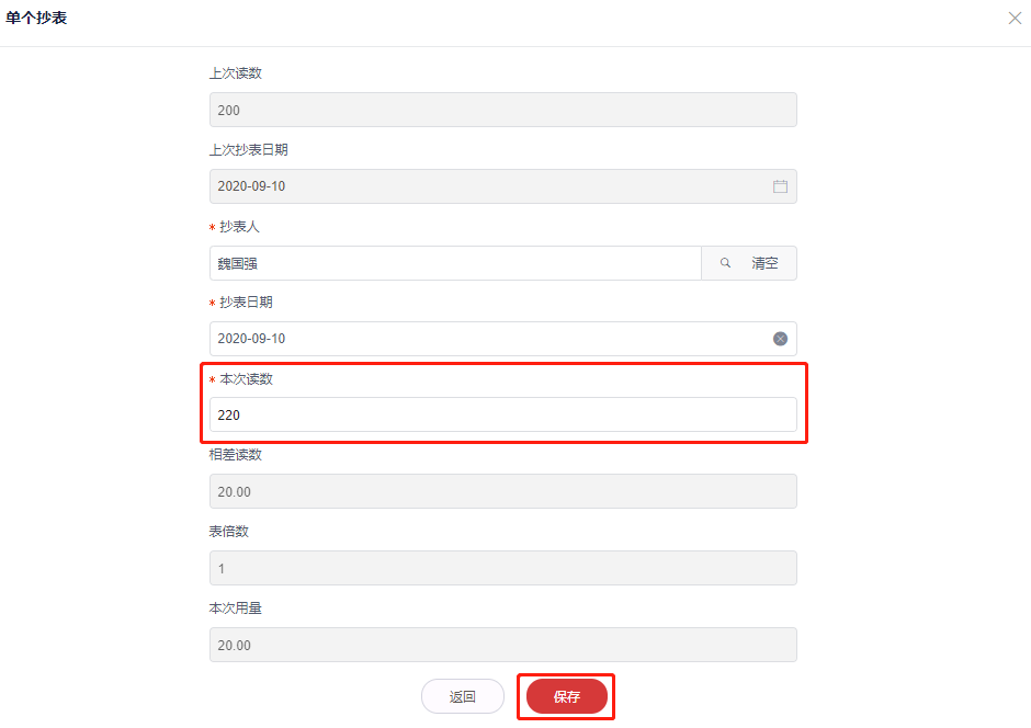 2,进入单个抄表弹窗,记录本次抄表信息后保存