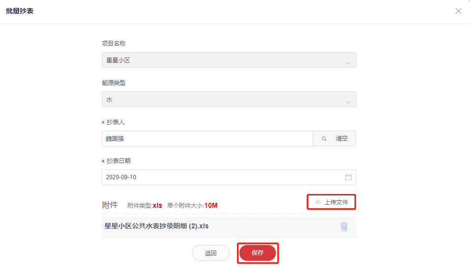 3,上传填写完本次抄表结果的能源批量抄表模板,点击保存