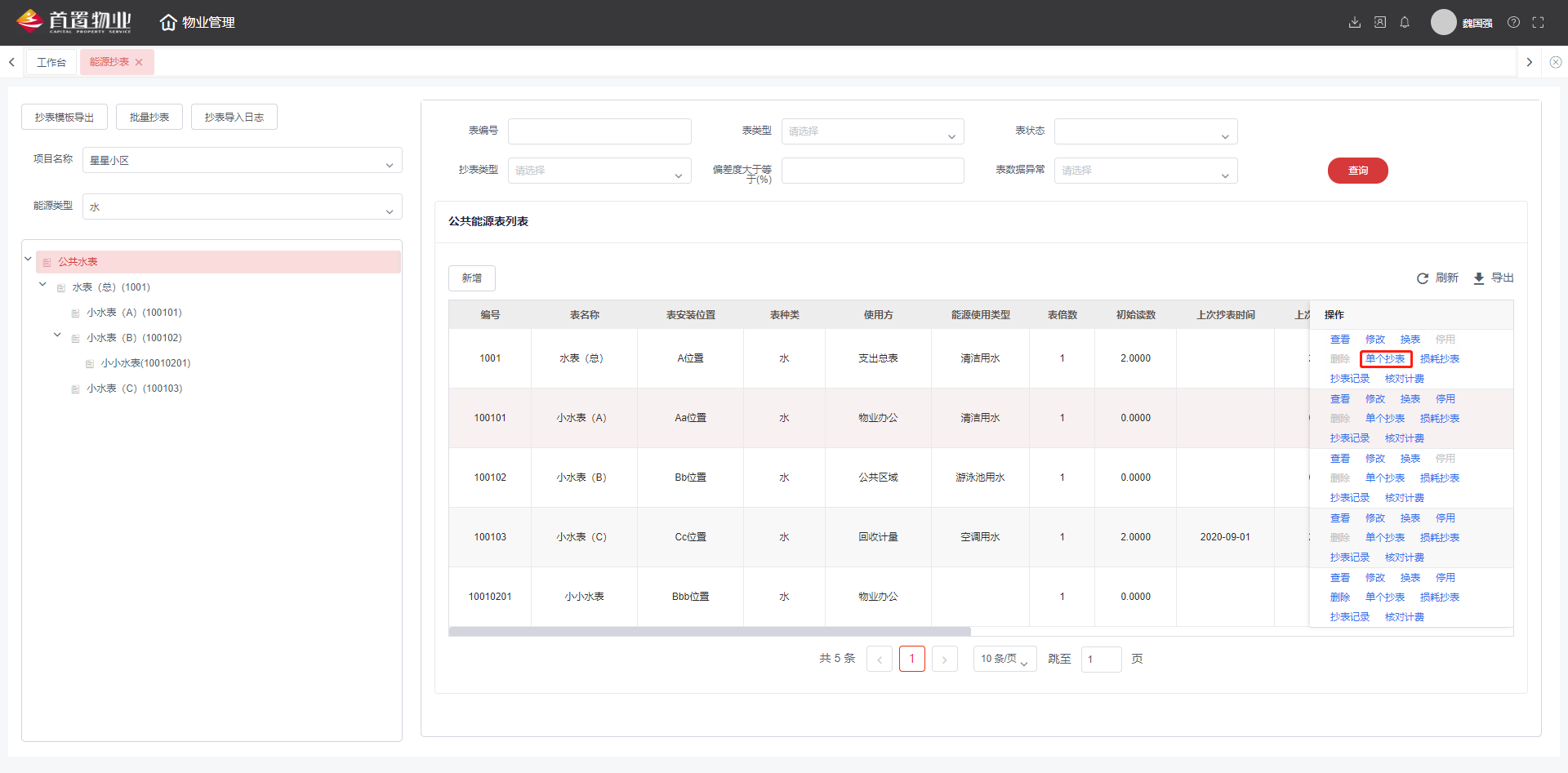 1,选择需要进行单个抄表的能源表信息,点击操域的单个抄表按钮