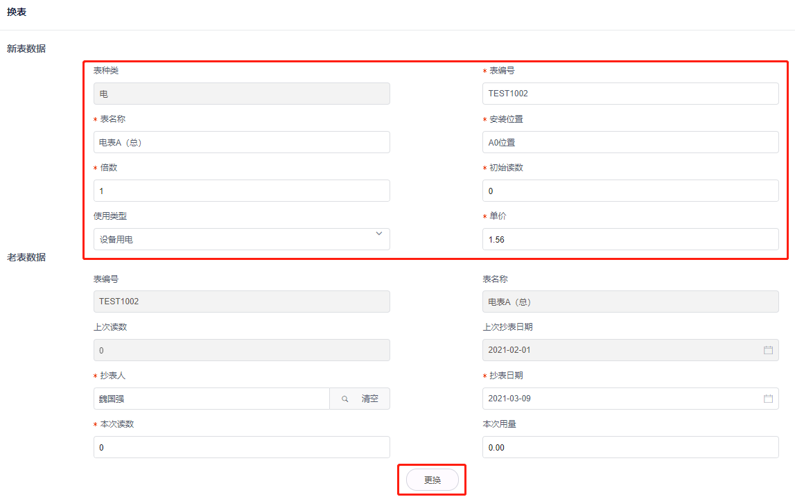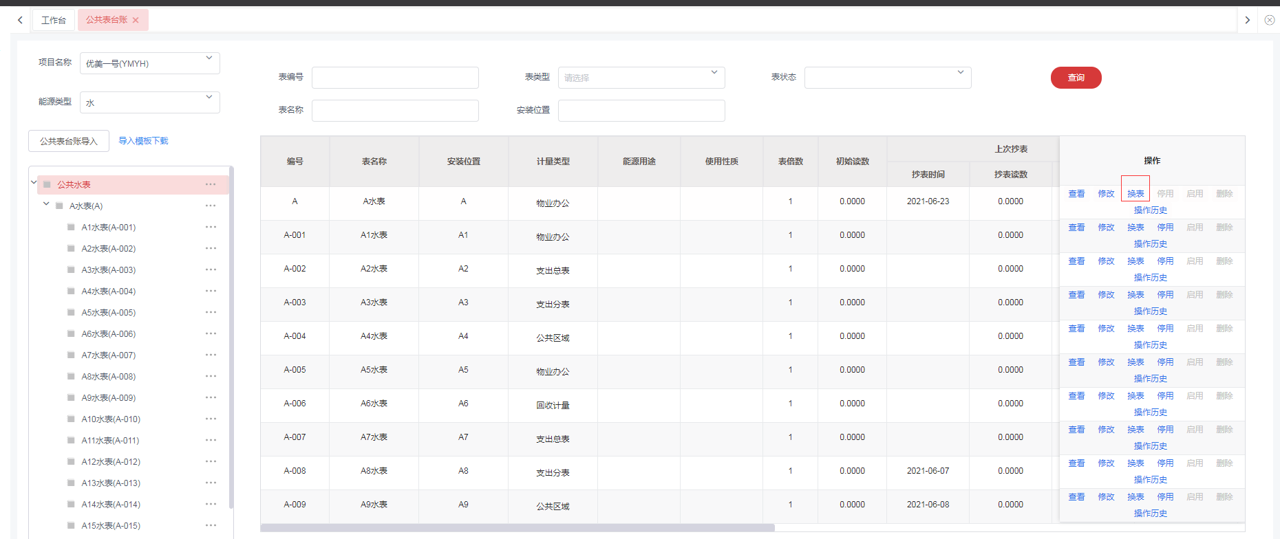 1,选择需要更换的能源表,点击点击**换表**
