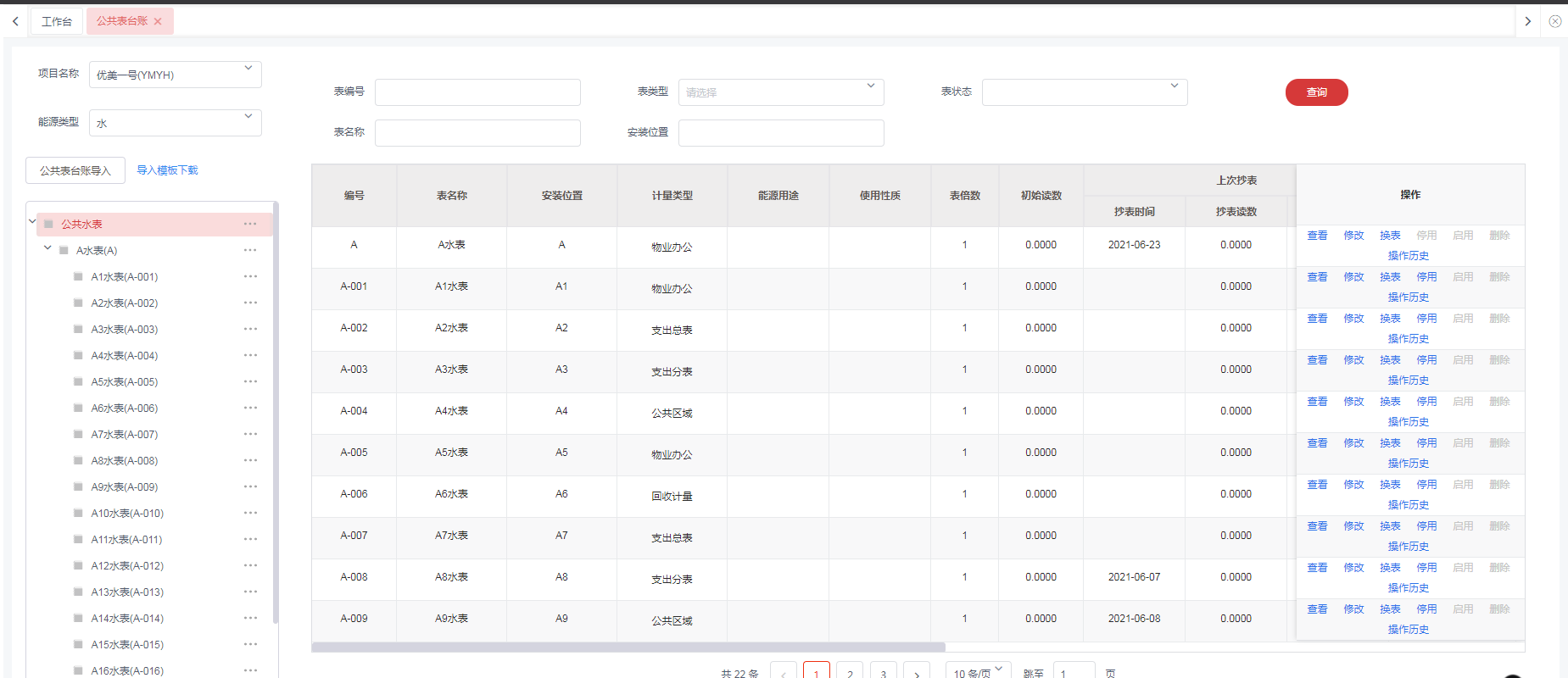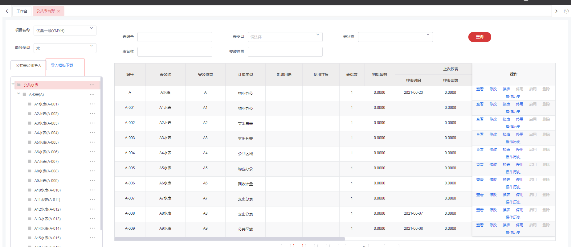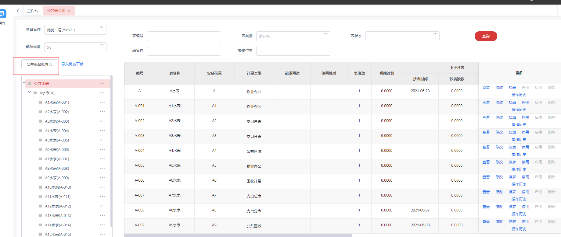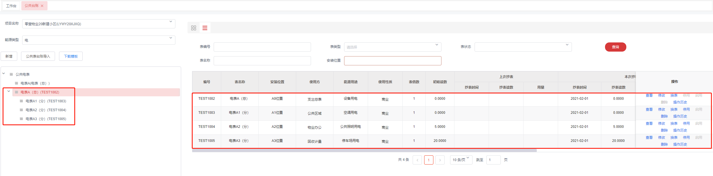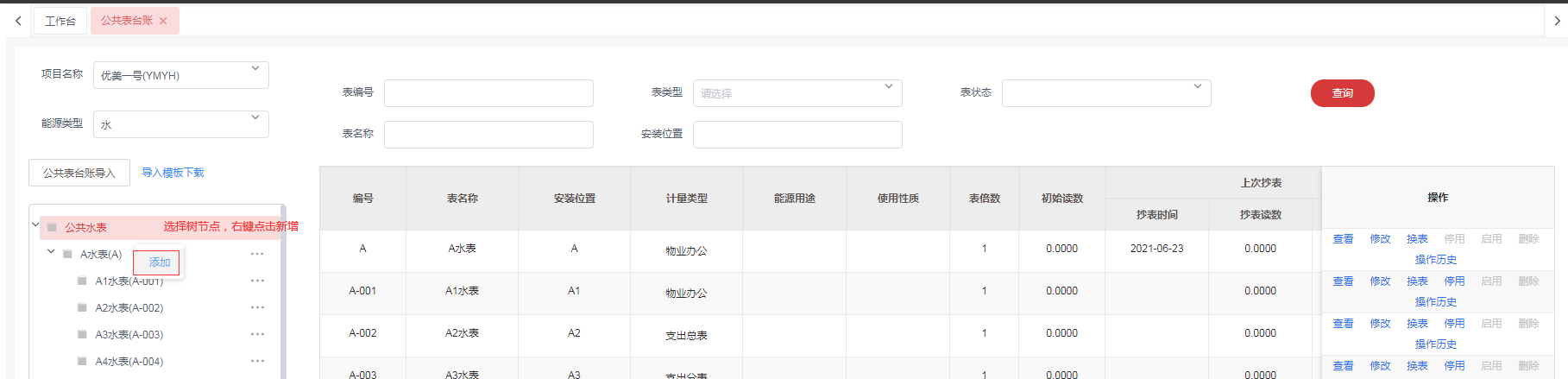 点击菜单:**工程管理 > 能耗管理 > 公共台账**