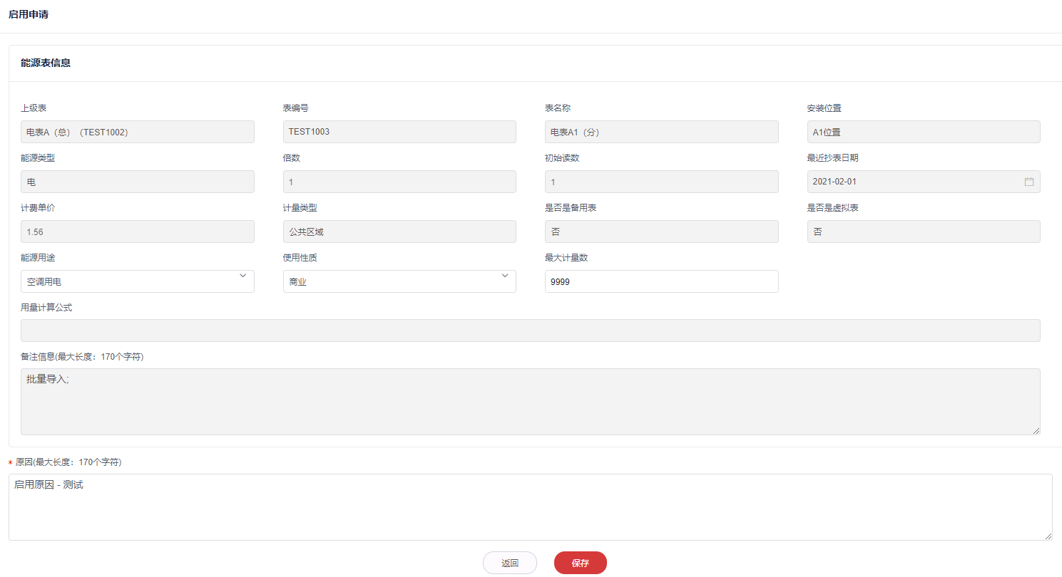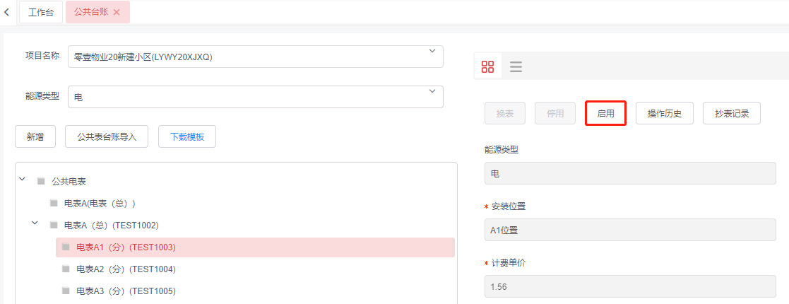 1,选择需要启用的停用状态能源表,点击**启用**按钮