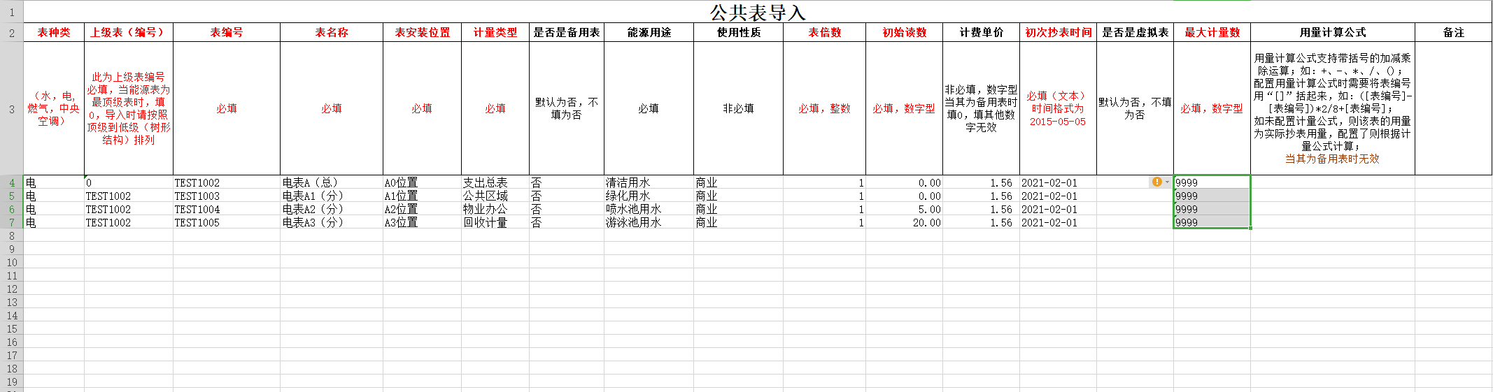 2,在模板中按规则填写正确的能源表信息,保存