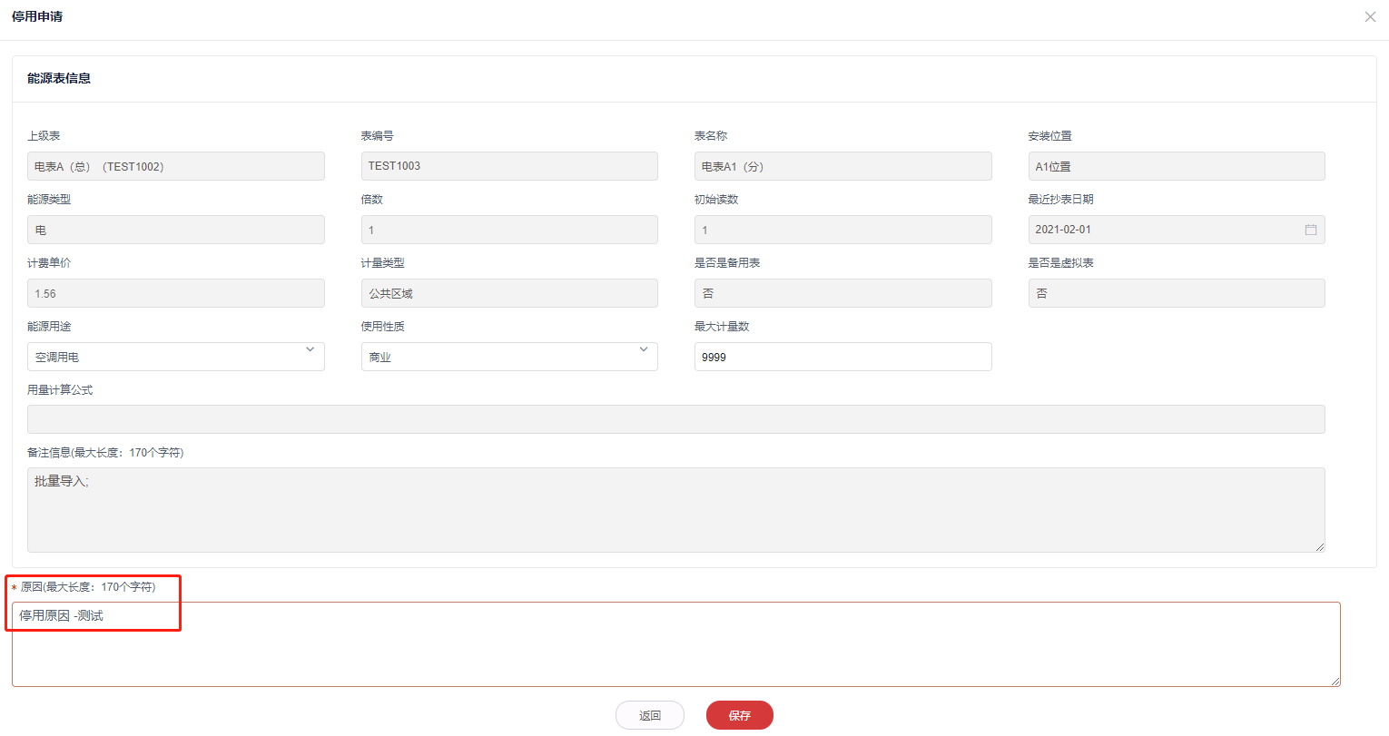 2,填写停用原因,保存,停用后不再支持换表,删除,修改,抄表操作