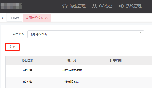 点击菜单:**物业管理 > 物业收费 > 费用定价发布**