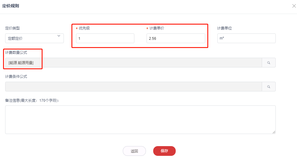 4,进入定价规则信息录入界面,选择**定额定价**,填写优先级,计费单价,计费数量公式(例如:计费数量公式选择“能源用量”,则入户抄表计算结果为:**金额=用量*单价**)