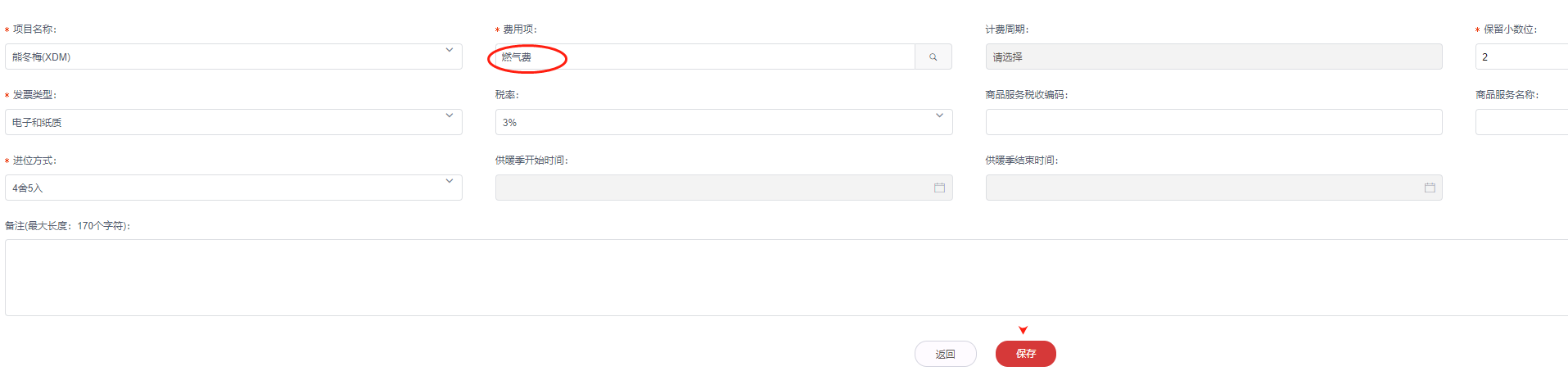 2,填写费用项,保留小数位,发票类型,进位方式等必填信息,保存