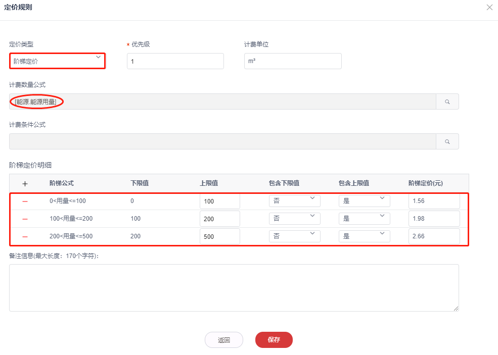 * 例如计费数量公式选择能源用量,阶梯定价明细配置阶梯下限与上限值,填写每级阶梯定价