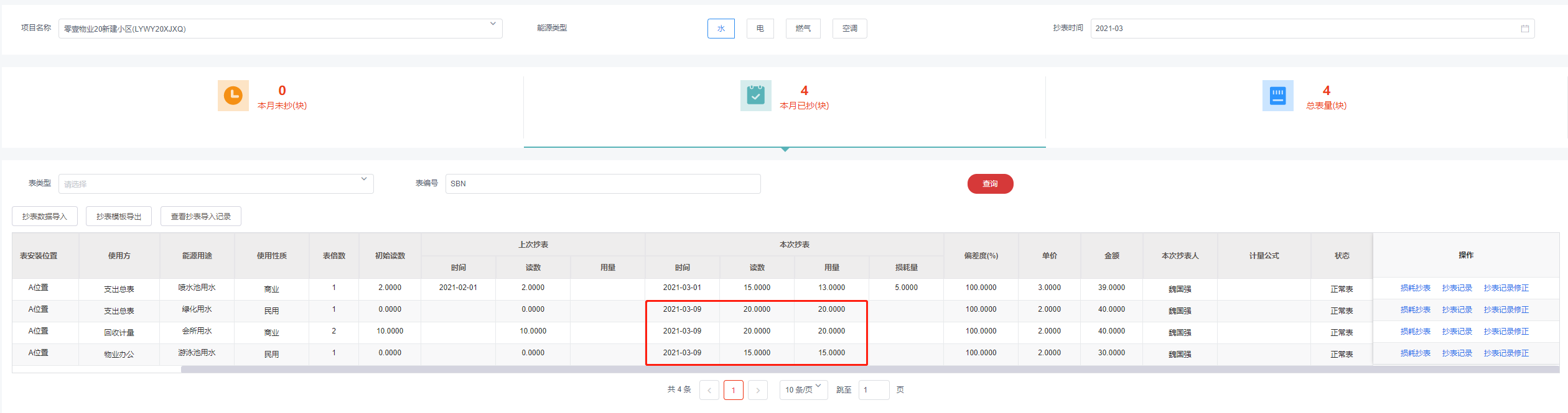 3.保存成功后,损耗值会自动记录至列表的本次抄表 - 损耗值字段
