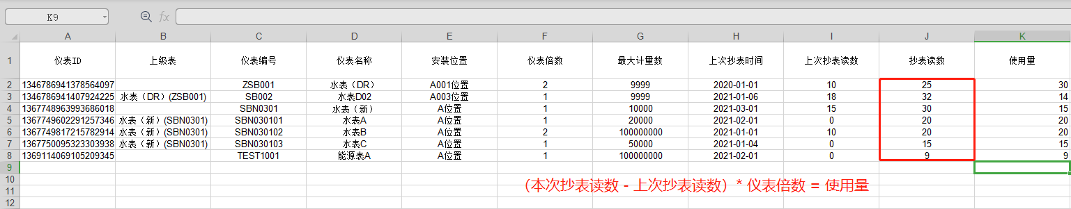 2.在模板中填写本次读数,会自动统计本次使用量