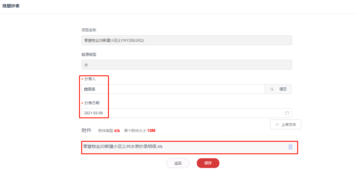 4.记录抄表人,抄表时间,上传编辑完成的抄表信息附件,保存