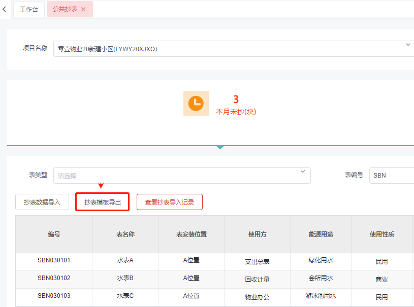 点击菜单:**工程管理 > 能耗管理 > 公共抄表**