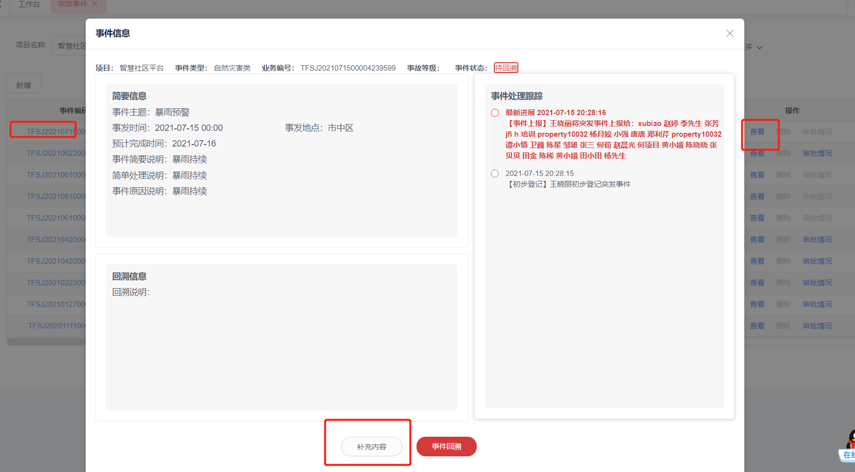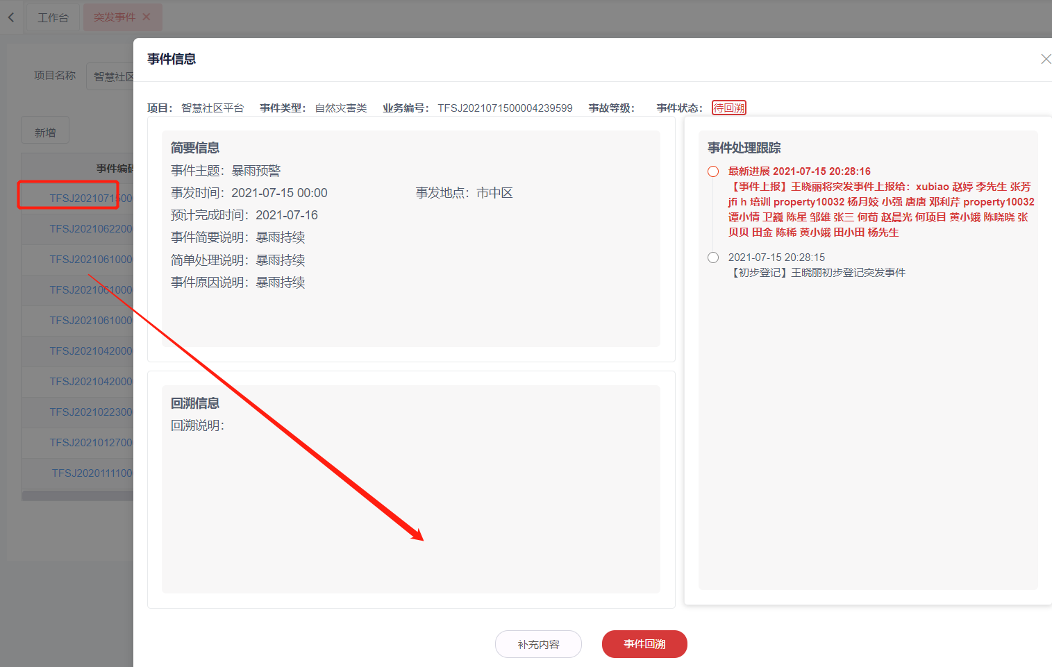 2.点击页面**事件回溯**按钮,填写回溯信息,进行保存。