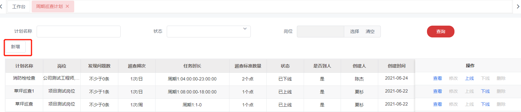 1. 选择**物业管理-->品质管理-->品质检查-->周期巡查计划** 。