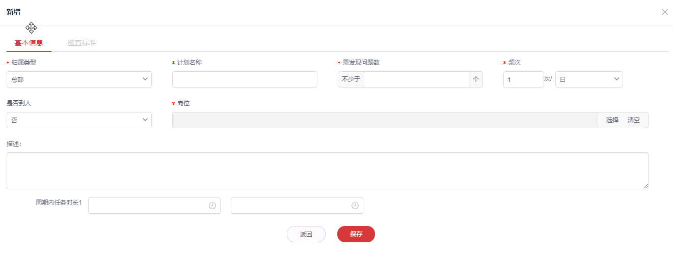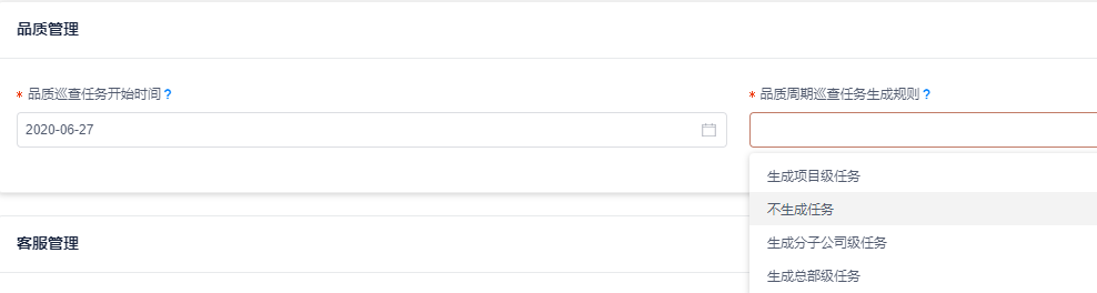 **归属类型**:选项为总部、分子公司、项目。系统将根据项目参数**品质周期巡查任务生成规则**的值来确定生成哪些周期任务。