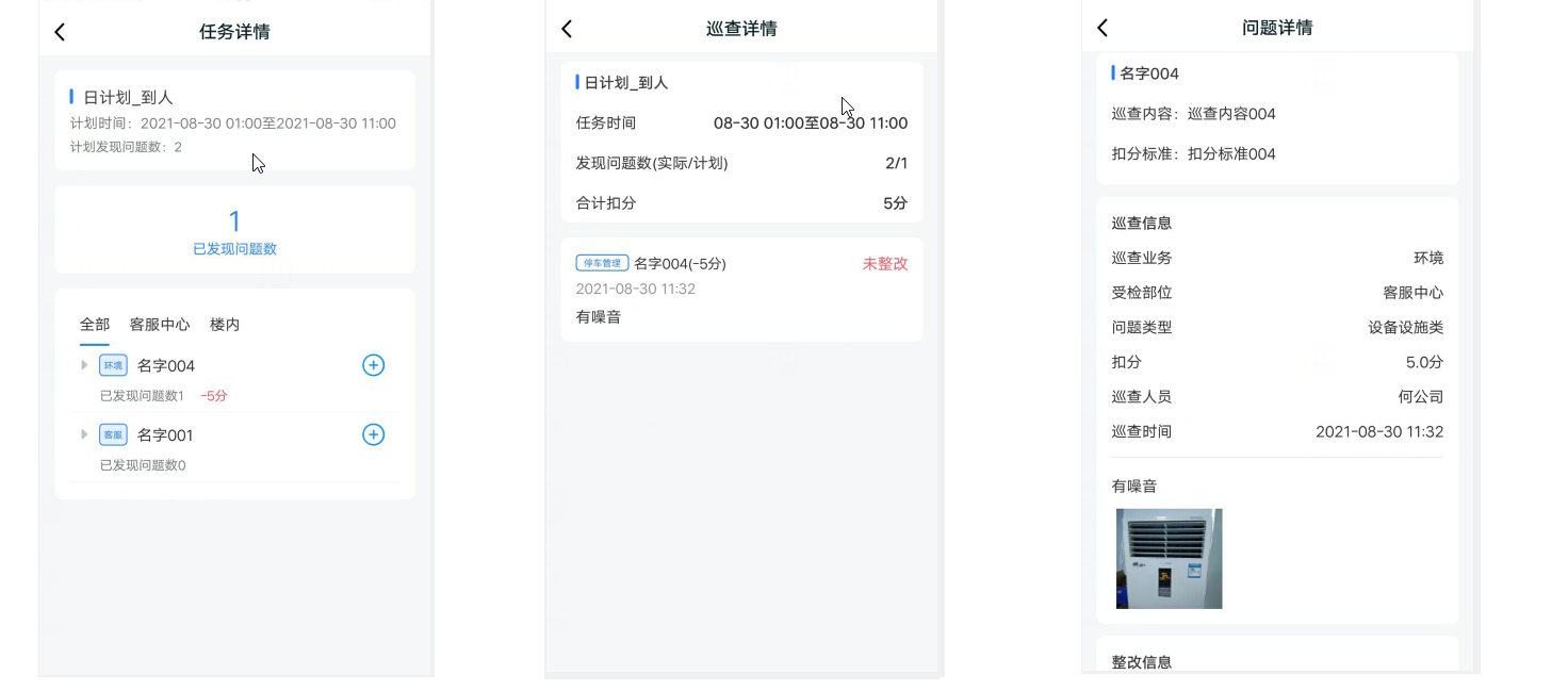 * 您可以在任务详情中,点击已发现问题,进入巡查详情。再点击问题,查看问题详情。