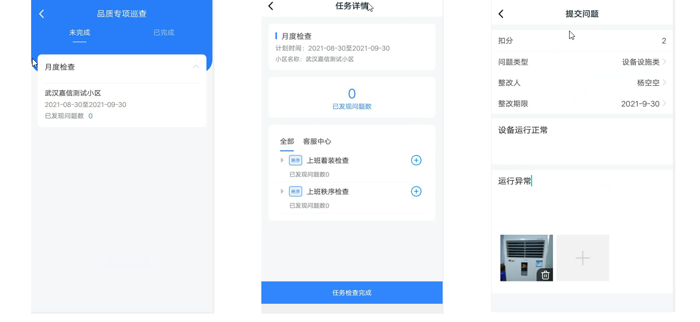 操作员可以在物业APP上,通过任务或者品质专项巡查菜单执行专项巡查任务。