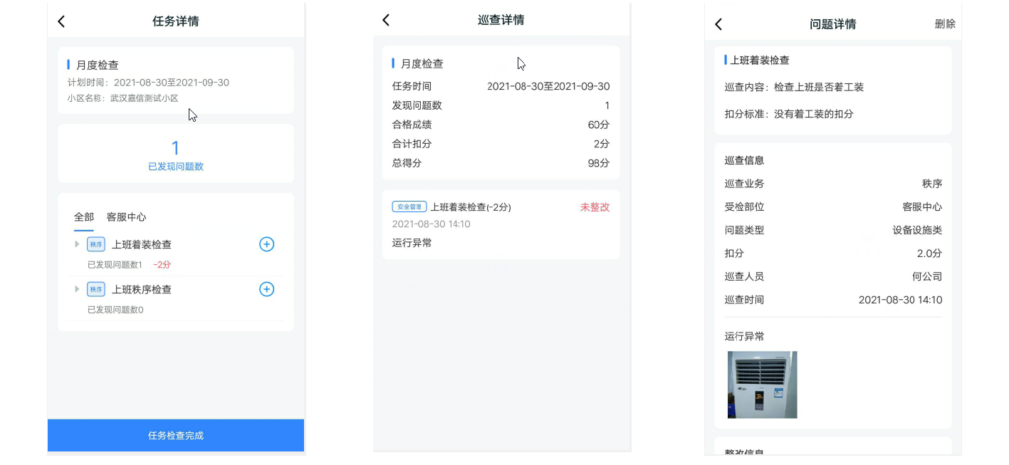 6. 当项目的所有巡查标准都已完成检查,请单击**任务检查完成**,则此项目的任务完成,后台会自动下发此任务提交的所有问题,并计算成绩,统计是否合格。