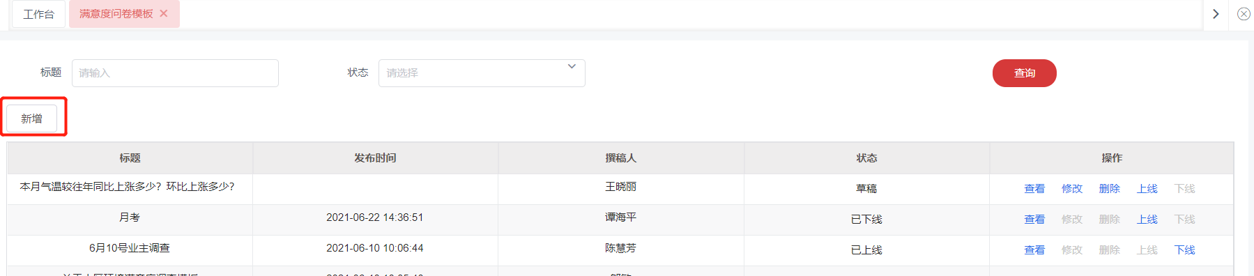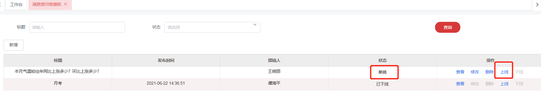 6.点击**上线**按钮。(模板要上线后,才能在满意度调查菜单中被引用)