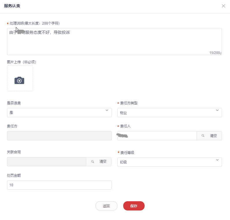 是否追责:默认为否。当选择为是时,需要设置责任人或者责任方。