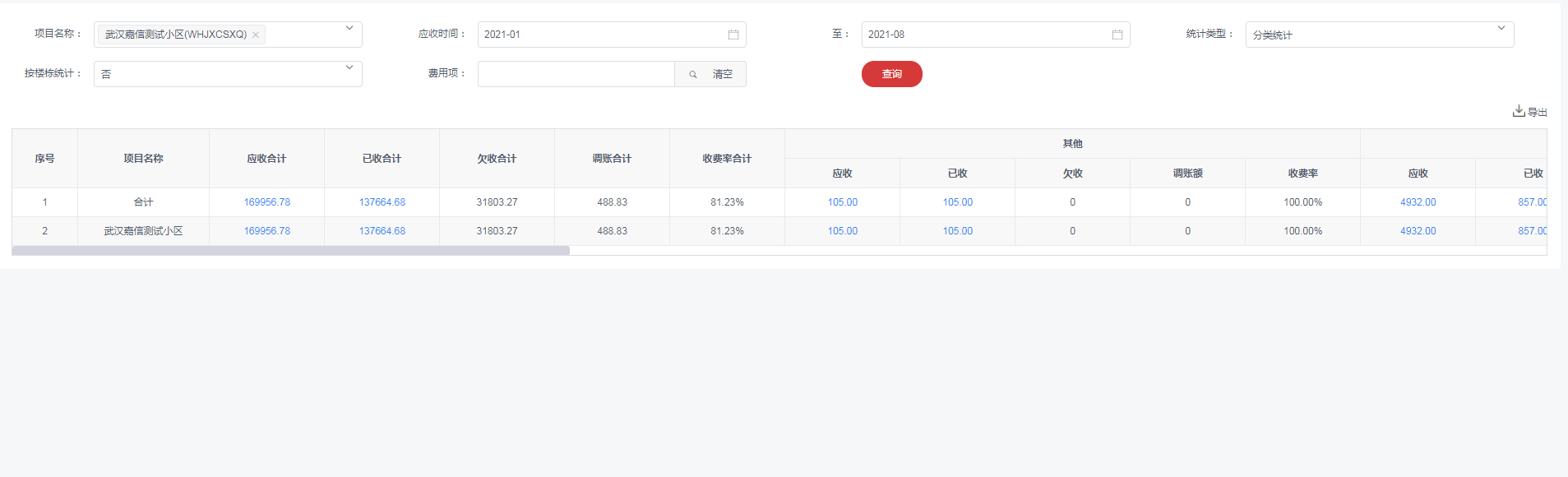 1.点击菜单:**物业管理-->费用报表-->应收报表-->项目应收统计**