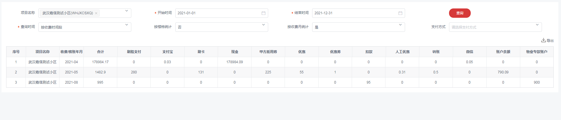 1. 选择**物业管理-->费用报表-->收费统计-->支付方式统计**