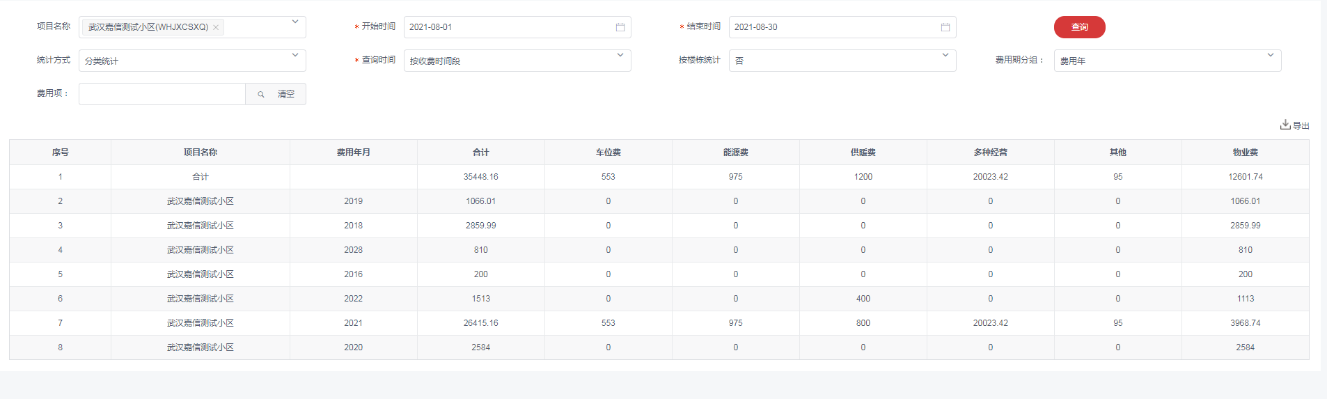 统计时间:年份、月份。根据统计时间选择的不同,列分别展示为费用年费或费用月份。