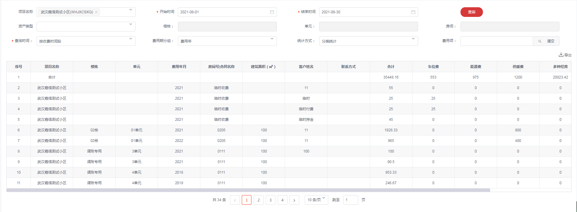 统计业主在指定的时间段内,缴纳的分别是哪些费用年或费用月的费用。
