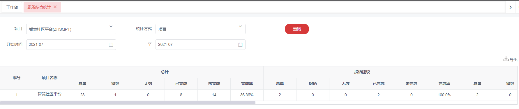 1. 选择**业务报表-->综合统计-->服务综合统计** 。