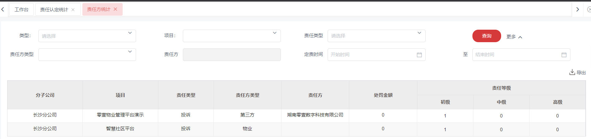 按责任类型不同,统计项目各责任方已认定的责任的处罚金额、责任等级等。