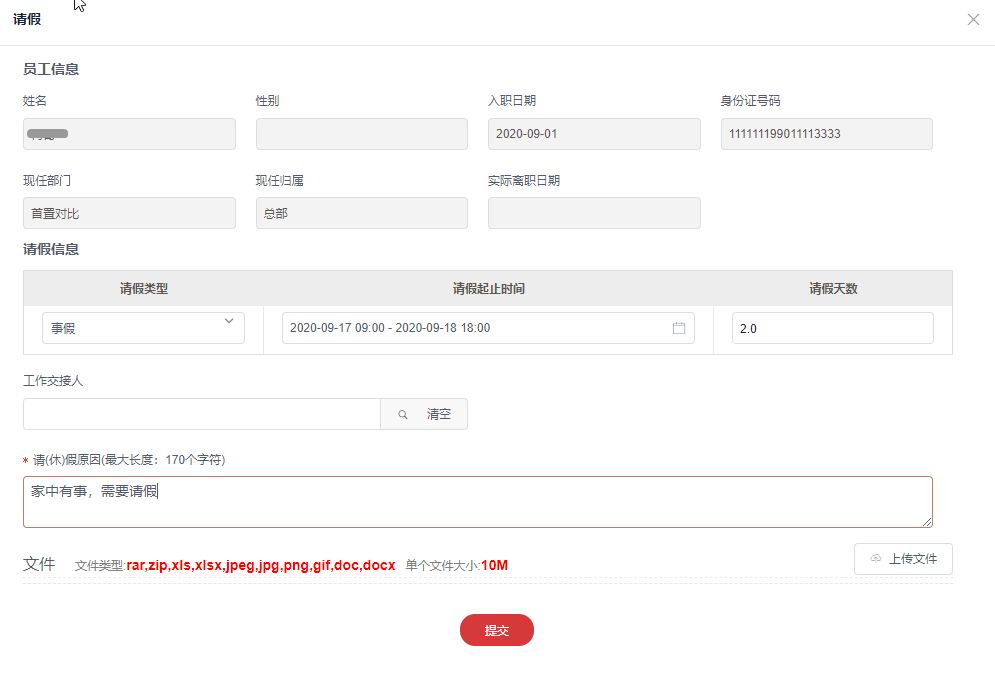 3.填写标红的必填信息和请假信息后,点击**提交**按钮。