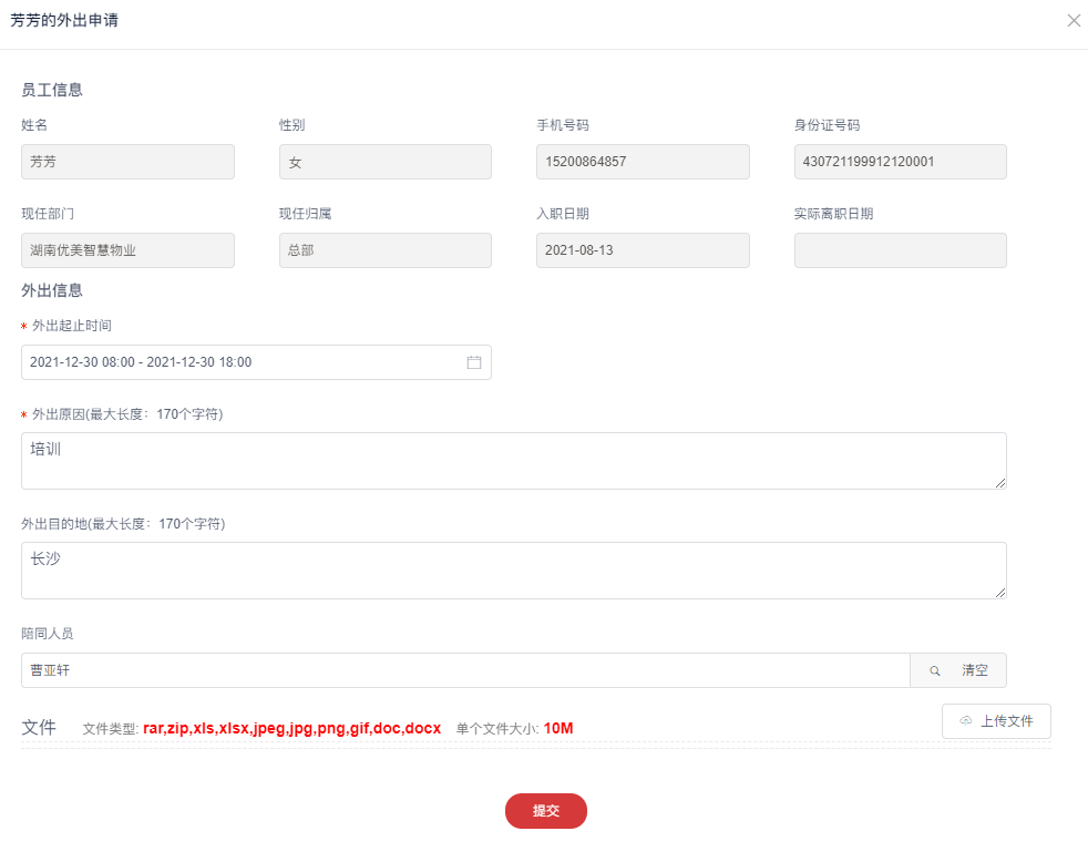 3.填写外出时间段、出差原因等信息后,点击**提交**按钮。
