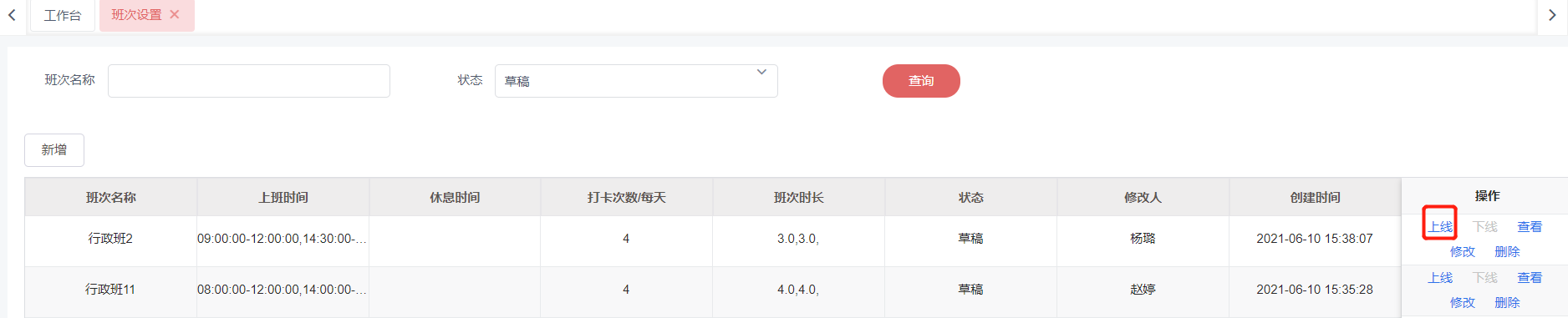 2.于列表点击需要上线的班次信息操作列的**上线**按钮
