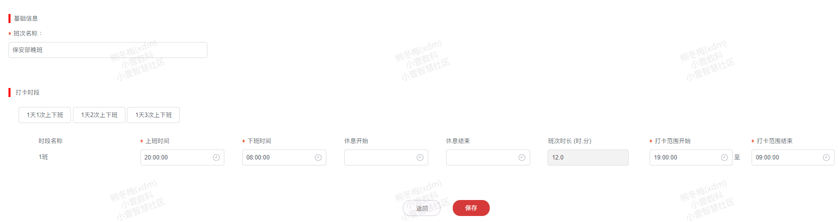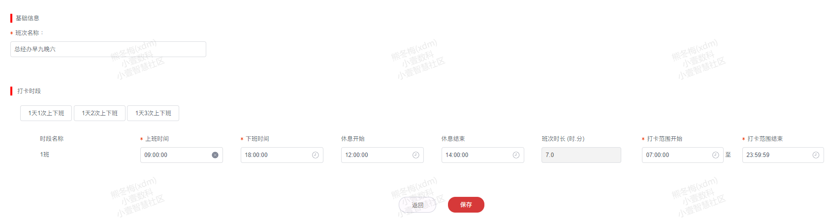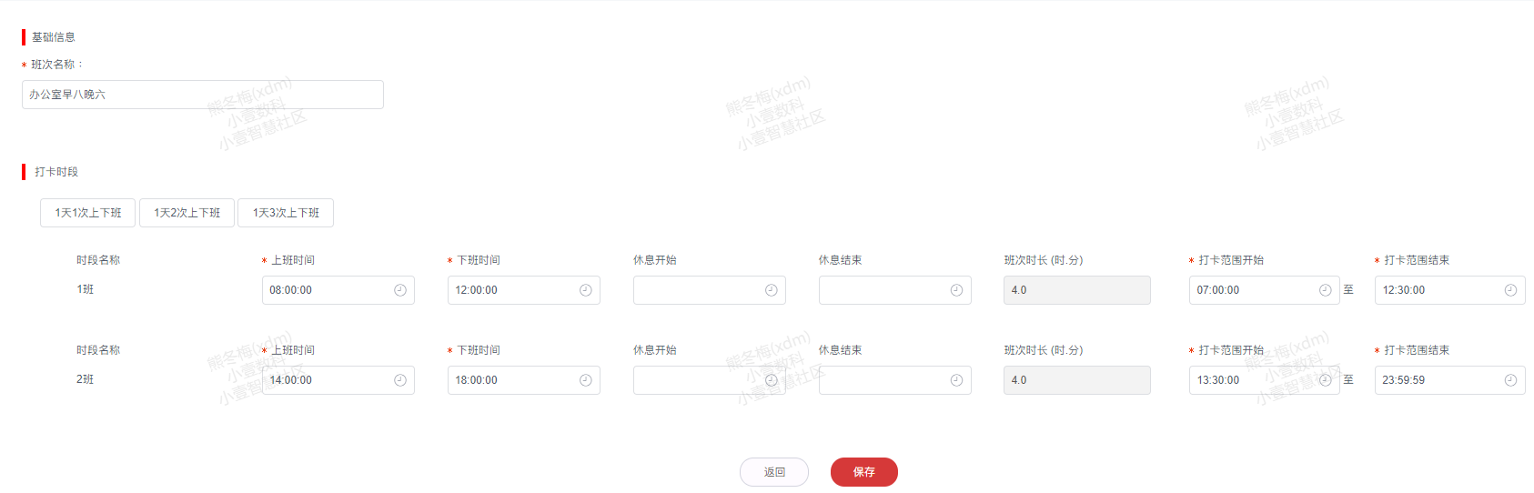 3.填写班次名称、打卡时段信息(①根据实际需要点击1天1次上下班或1天2次上下班打卡时段②填写相应的上班时间、修改时间、打卡范围)后点击**保存**按钮