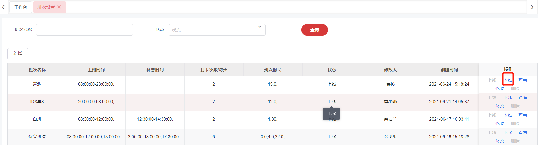 2.于列表点击需要下线的在班次信息操作列的**下线**按钮